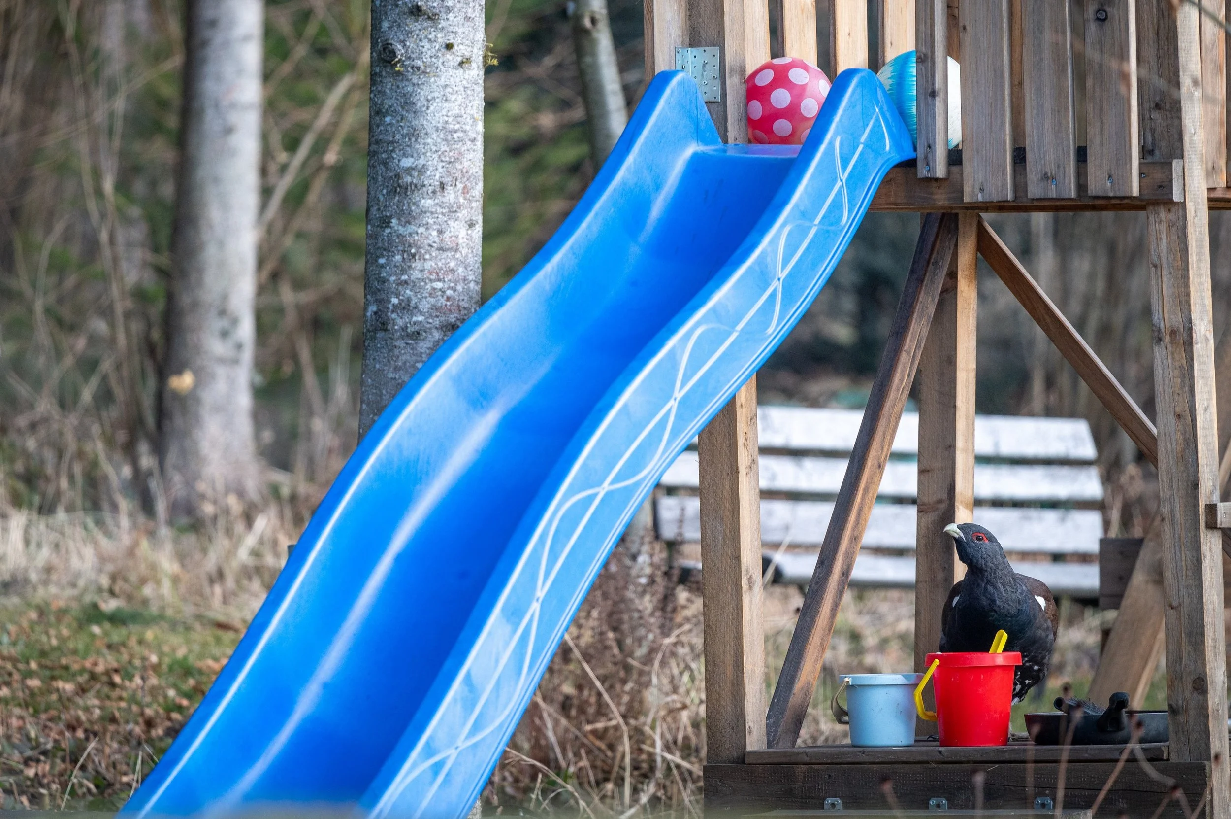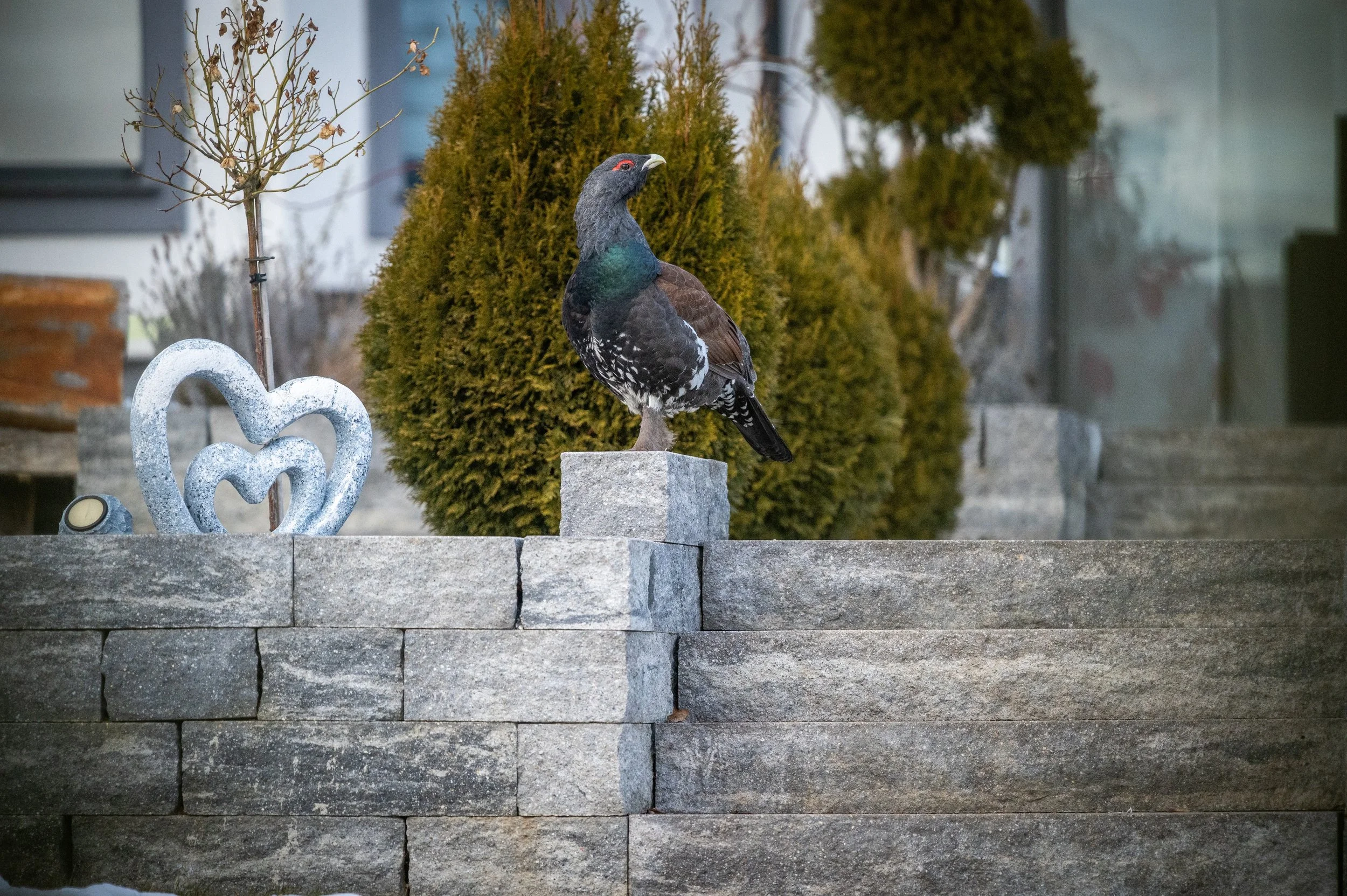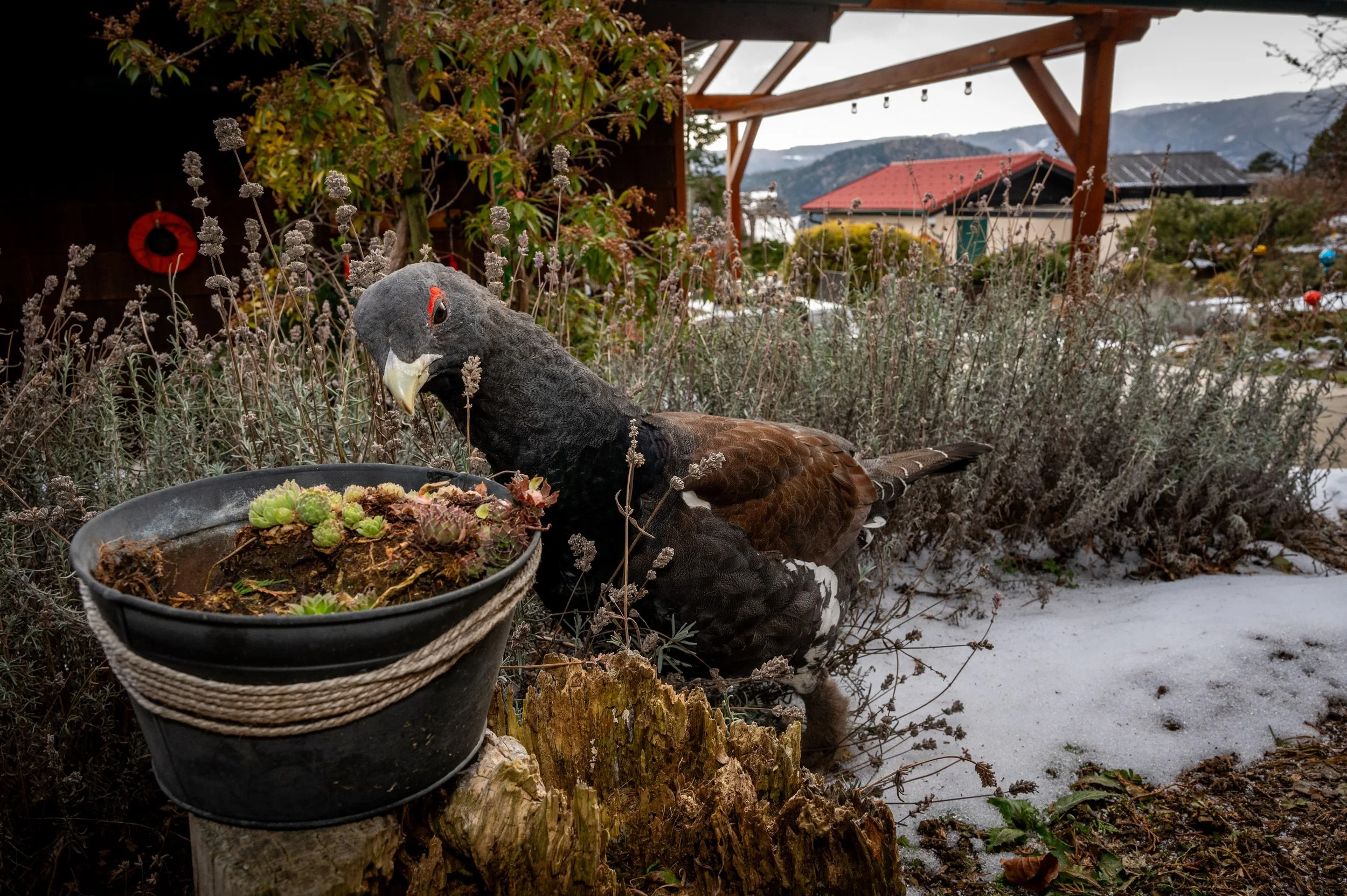 Navečer jsem se opět vypravil prozkoumat místo dopoledního pozorování, jestli se tetřev opět neukáže. Na místě už sice nebyl, ale po chvíli mi přišla smska od mé ženy, ať se rychle vrátím na ubytování - tetřev sem prý přiletěl na krmítko. Nemohl jsem uvěřit vlastním očím, ale bylo to skutečně tak. Tetřev se procházel po naší zahradě, ozobával pupeny okrasných dřevin a nebo si sedal přímo na krmítko. Podle slov majitele, se tetřev na jeho zahradě a na krmítku objevil ten den poprvé. Jelikož jsem zvyklý fotografovat primárně divoká zvířata ve volné přírodě, zpočátku jsem se snažil tetřeva dokumentovat tak, aby na snímcích nebyly vidět žádné civilizační výdobytky. Když nám ale teď přistál na zahradě, hned mi bylo jasné, že bude mnohem cennější a zároveň autentičtější zaznamenávat jeho chování v blízkosti lidských obydlí, tak jak je. Fotografování zvířecích jedinců habituovaných do lidské blízkosti nebo přímo synantropizovaných druhů je aktuálně ve zvířecí fotografii poměrně velký trend, který bývá označován jako tzv. urban wildlife. Tomuhle žánru jsem se dosud nevěnoval, ale tentokrát se to vyloženě nabízelo, přece jen, komu se poštěstí s ním začít s takto unikátním ptačím druhem.