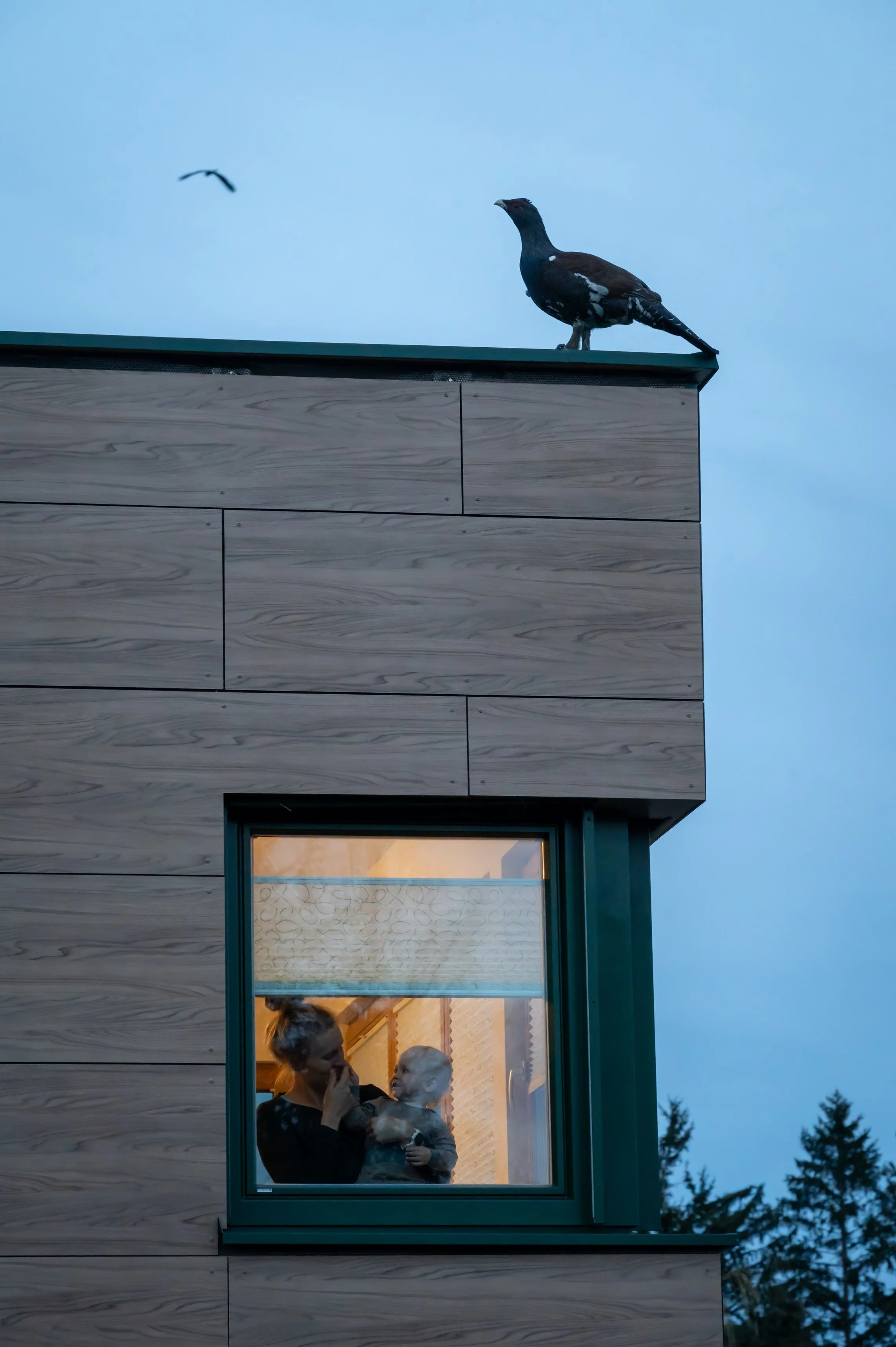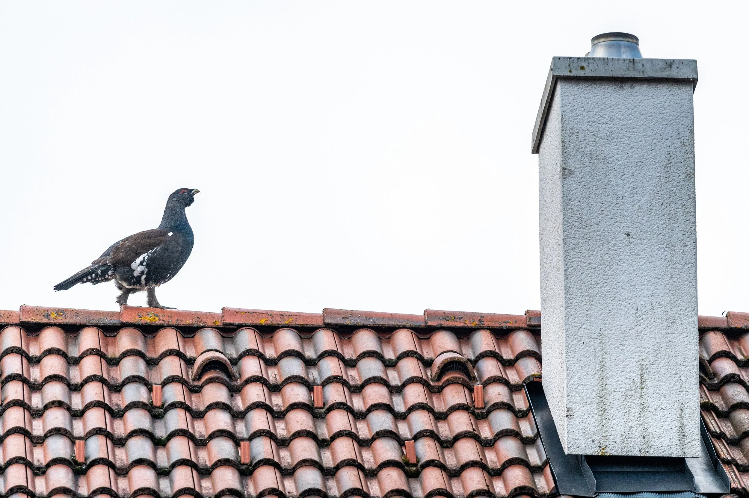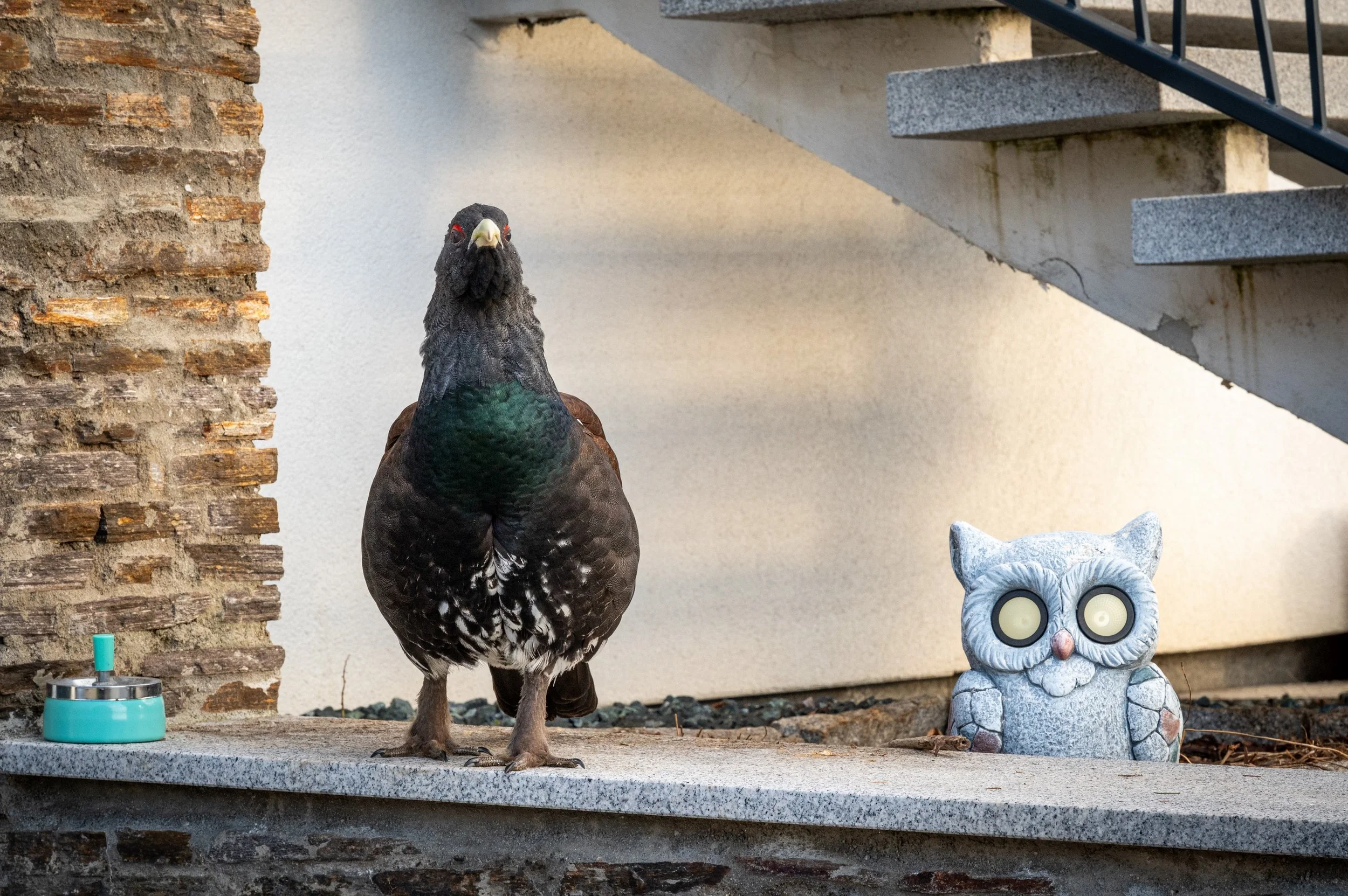 Navečer jsem se opět vypravil prozkoumat místo dopoledního pozorování, jestli se tetřev opět neukáže. Na místě už sice nebyl, ale po chvíli mi přišla smska od mé ženy, ať se rychle vrátím na ubytování - tetřev sem prý přiletěl na krmítko. Nemohl jsem uvěřit vlastním očím, ale bylo to skutečně tak. Tetřev se procházel po naší zahradě, ozobával pupeny okrasných dřevin a nebo si sedal přímo na krmítko. Podle slov majitele, se tetřev na jeho zahradě a na krmítku objevil ten den poprvé. Jelikož jsem zvyklý fotografovat primárně divoká zvířata ve volné přírodě, zpočátku jsem se snažil tetřeva dokumentovat tak, aby na snímcích nebyly vidět žádné civilizační výdobytky. Když nám ale teď přistál na zahradě, hned mi bylo jasné, že bude mnohem cennější a zároveň autentičtější zaznamenávat jeho chování v blízkosti lidských obydlí, tak jak je. Fotografování zvířecích jedinců habituovaných do lidské blízkosti nebo přímo synantropizovaných druhů je aktuálně ve zvířecí fotografii poměrně velký trend, který bývá označován jako tzv. urban wildlife. Tomuhle žánru jsem se dosud nevěnoval, ale tentokrát se to vyloženě nabízelo, přece jen, komu se poštěstí s ním začít s takto unikátním ptačím druhem.